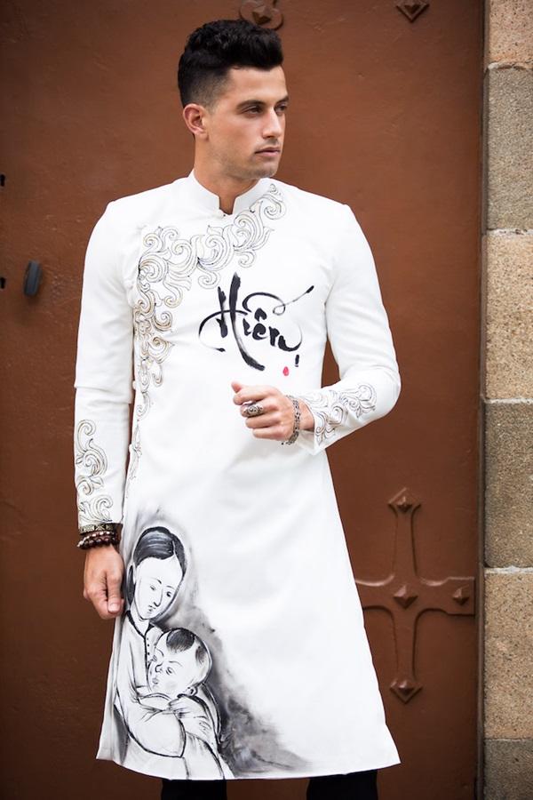 đặc biệt chọn cho anh bộ áo dài màu trắng với chữ Hiếu cùng hình ảnh tình mẹ ấm áp.
