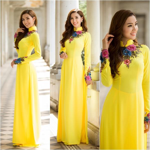 Bên cạnh nam vương, Ngọc Loan diện các thiết kế áo dài nền nã, khoe vẻ đẹp yểu điệu, dịu