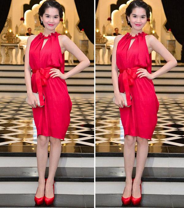 Chiếc váy đỏ thiết kế sun nhún cổ và thắt nơ tại eo tạo điểm nhấn cho vóc dáng Ngọc Trinh.