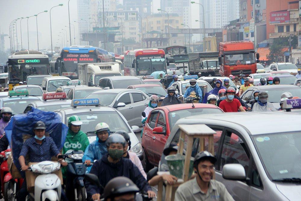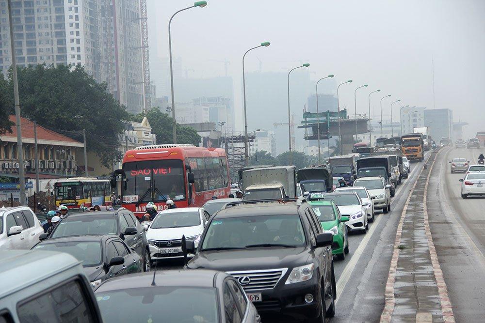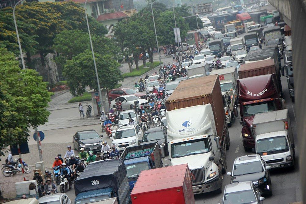 Các tuyến đường cửa ngõ phía Tây TP như đường Phạm Văn Đồng, Phạm Hùng, Khuất Duy Tiến, đại lộ Thăng Long lượng xe khách, ô tô cá nhân rất lớn cùng với xe container, xe tải chiếm cả lòng đường khiến nhiều xe máy phải len lỏi khó nhọc.
