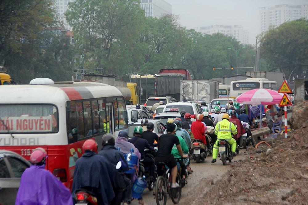 Các nút giao với Hoàng Quốc Việt, Trần Quốc Hoàn luôn trong cảnh ùn tắc, đường sá lầy lội do mưa di chuyển rất khó khăn.
