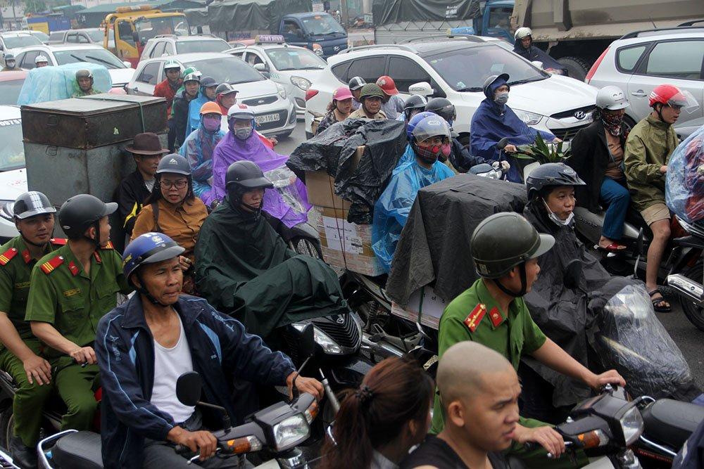 CSGT có một buổi sáng vất vả phân luồng trong mưa, bụi