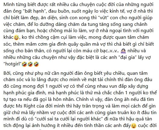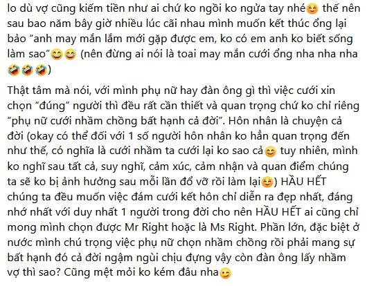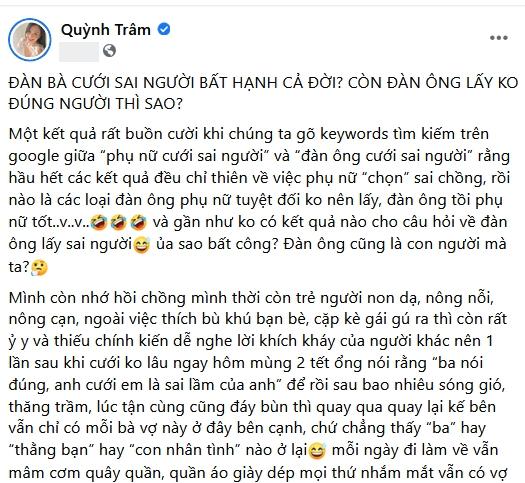 Tuy nhiên, cô cảm thấy buồn cười vì kết quả tìm kiếm trên mạng hầu hết thiên về việc phụ nữ chọn sai chồng, gần như không có kết quả nào cho câu hỏi về đàn ông lấy sai người.