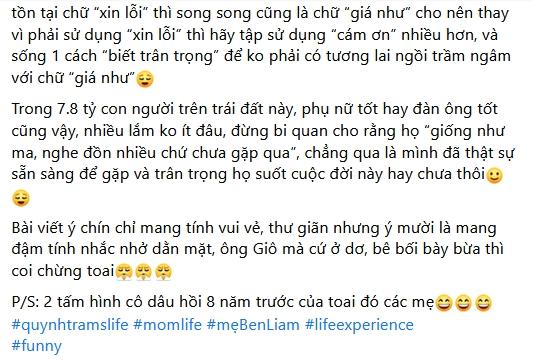 "Bài viết ý 'chín' chỉ mang tính vui vẻ, thư giãn, nhưng ý mười là mang đậm tính nhắc nhở dằn mặt. Ông Giô mà cứ ở dơ, bê bối bày bừa thì coi chừng tôi", Quỳnh Trâm hài hước khép lại.