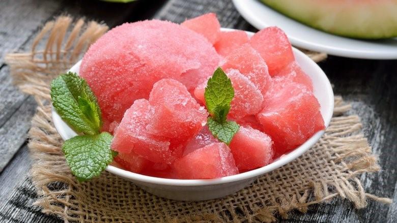 Tất cả chỗ dưa hấu còn sót lại sau bữa ăn buổi trưa đều có thể dùng làm nguyên liệu cho món dưa hấu đá bào buổi tối. Chỉ cần bỏ vào máy xay dưa hấu xắt nhỏ và đã loại bỏ hạt, thêm chút nước cốt canh, xay nhuyễn tất cả rồi đổ ra khay, dàn đều. Bạn có thể cho thêm chocolate chips nếu muốn, để trang trí thay cho những hạt dưa đã loại bỏ, còn món dưa hấu đá bào thì thêm ngon hơn. Ngoài dưa hấu, bạn có thể dùng cam để thay thế.