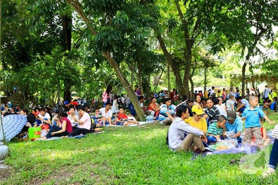 Càng về trưa, thời tiết càng oi bức khiến nhiều gia đình phải vất vả chăm sóc cho trẻ nhỏ. Hầu hết các nhóm, gia đình đều mang theo bạt, ni lông, họ trải dày đặc trên thảm cỏ để bày đồ ăn, thức uống dùng qua trưa.