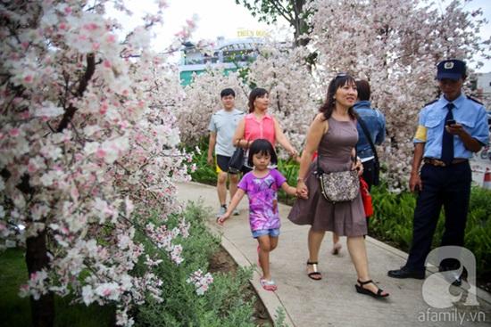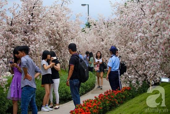 Tương tự, tại một địa điểm vui chơi ở khuôn viên vườn hoa anh đào của một khu thương mại ở Q.Bình Tân cũng đông người vì không gian mới lạ lại không mất tiền vé.