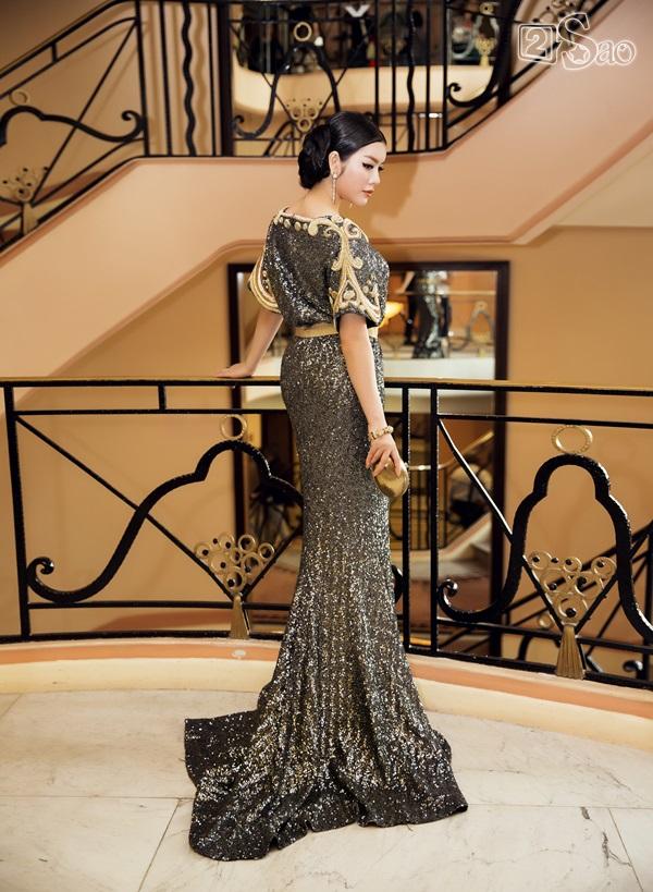 Đầm kim sa đuôi cá Lý Nhã Kỳ diện được thiết kế với cảm hứng đậm chất Ai Cập cổ xưa, với hoạ tiết cổ áo và tay áo thể hiện sự quyền uy của một nữ thần, thuộc dòng haute couture đỉnh cao. Chất liệu vải kim sa rủ mềm của chiếc đầm tạo nên những bước đi uyển chuyển, quyến rũ. Tôn vẻ đẹp diễm lệ với sắc vóc của một nữ thần cho Lý Nhã Kỳ, chuyên gia trang điểm Minh Lộc đã sử dụng cách trang điểm mắt mèo quyền lực của nữ hoàng Cleopartra, tóc ướt rẽ ngôi giữa, được búi phồng phía sau sang trọng, đài các.