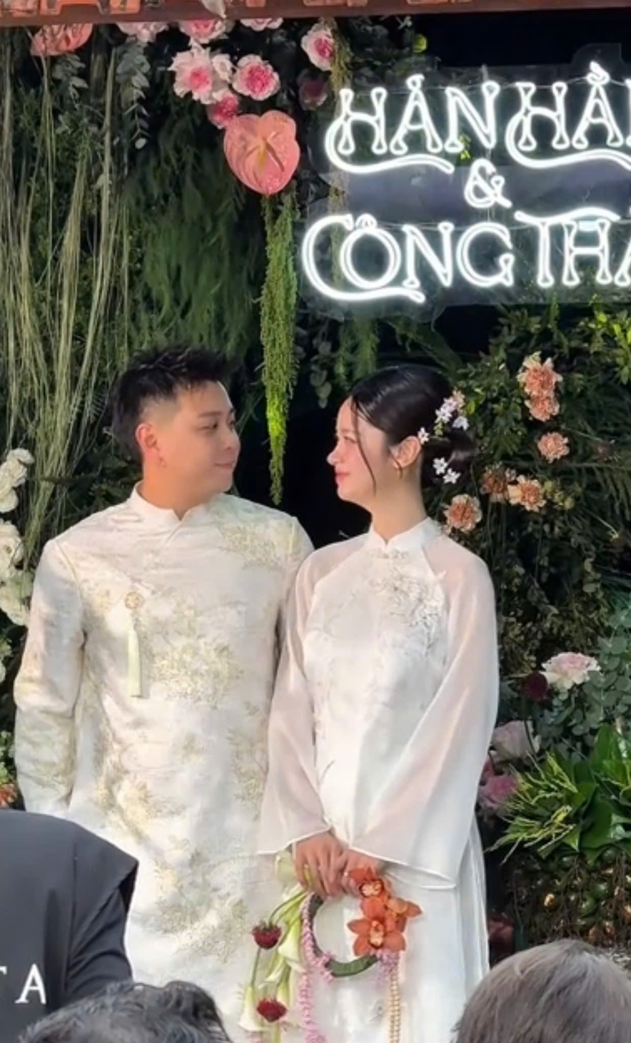 Visual Hàn Hằng một lần nữa thu hút sự chú ý của netizen. Cô dâu búi tóc cài hoa, chọn tone makeup trong trẻo. Đặc biệt hot girl Thanh Hóa vô cùng tươi tắn khi xuất hiện bên chồng.