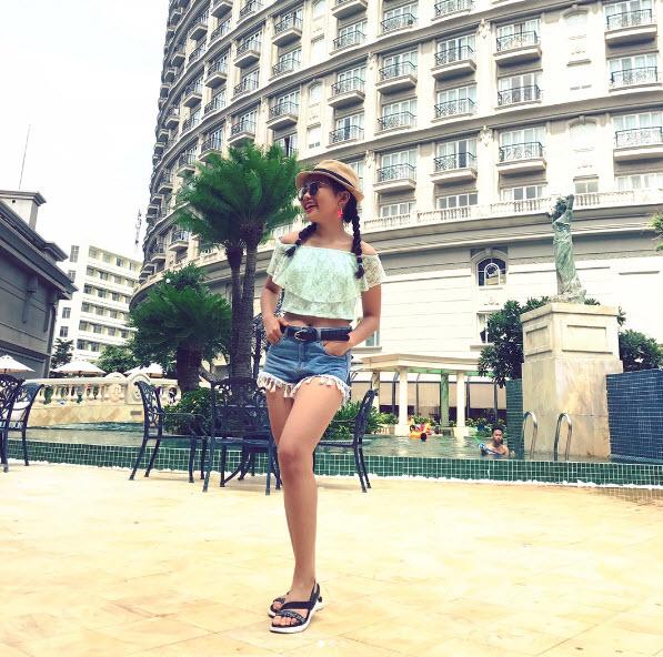 Phương Mỹ Chi chọn trang phục thoải mái khi ra bể bơi