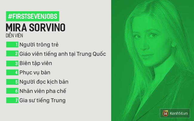 Trước khi trở thành nữ diễn viên hạng A với giải thưởng Academic Award và Quả cầu vàng vào năm 1995, Mira Sorvino cũng từng lặn lộn với cuộc sống trên đủ vai trò: từ trông trẻ, làm giáo viên tiếng Anh tại Trung Quốc, bồi bàn cho tới... dạy tiếng Trung!