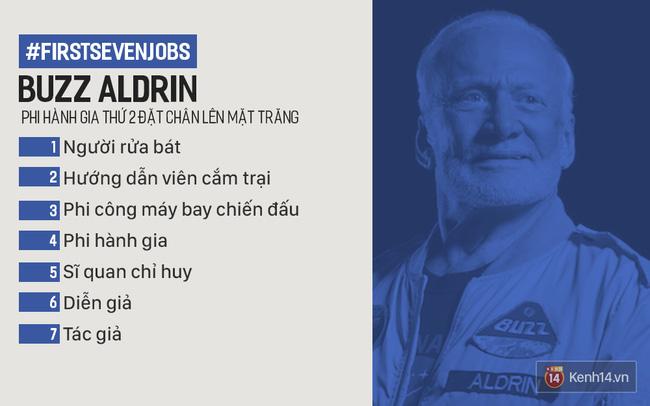 Trong danh sách những người nổi tiếng với trào lưu #firstsevenjobs, người ta còn thấy sự xuất hiện của Buzz Aldrin, người thứ hai đặt chân lên Mặt Trăng, chỉ sau phi công chỉ huy Neil Armstrong. Trước khi có cơ hội được bay vào không gian, ông đã phải làm những công việc nhỏ nhặt nhất như người rửa bát, hướng dẫn viên cắm trại...
