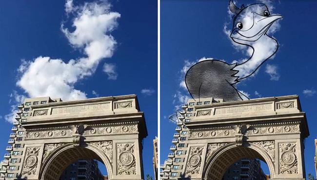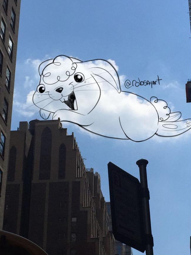 Chắc hẳn ai cũng đã từng một lần ngắm nhìn những đám mây bồng bềnh lững lờ trôi trên bầu trời và liên tưởng tới nhiều hình ảnh thú vị. Họa sĩ người Mỹ Rob Sayegh cũng vậy, mỗi lần ngắm mây, anh lại cho ra đời một bức tranh. Phải nói rằng, trí tưởng tượng của chàng trai tới từ New York này rất phong phú. Trong con mắt của anh, bất cứ đám mây nào cũng có thể biến thành các nhân vật hoạt hình ngộ nghĩnh.