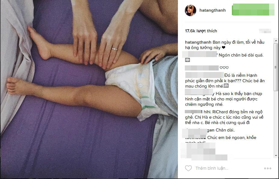 Mới đây, Tăng Thanh Hà lại gây sốt với công chúng khi hé lộ về công việc thường kỳ vào buổi tối của mình sau một ngày làm việc: Ban ngày đi làm, tối về hầu hạ ông tướng này. Qua hình ảnh cho thấy, trong khi quý tử nằm thư giãn thoải mái trên giường thì mẹ Hà nhẹ nhàng ngồi bên xoa bóp mát xa cho con trai.