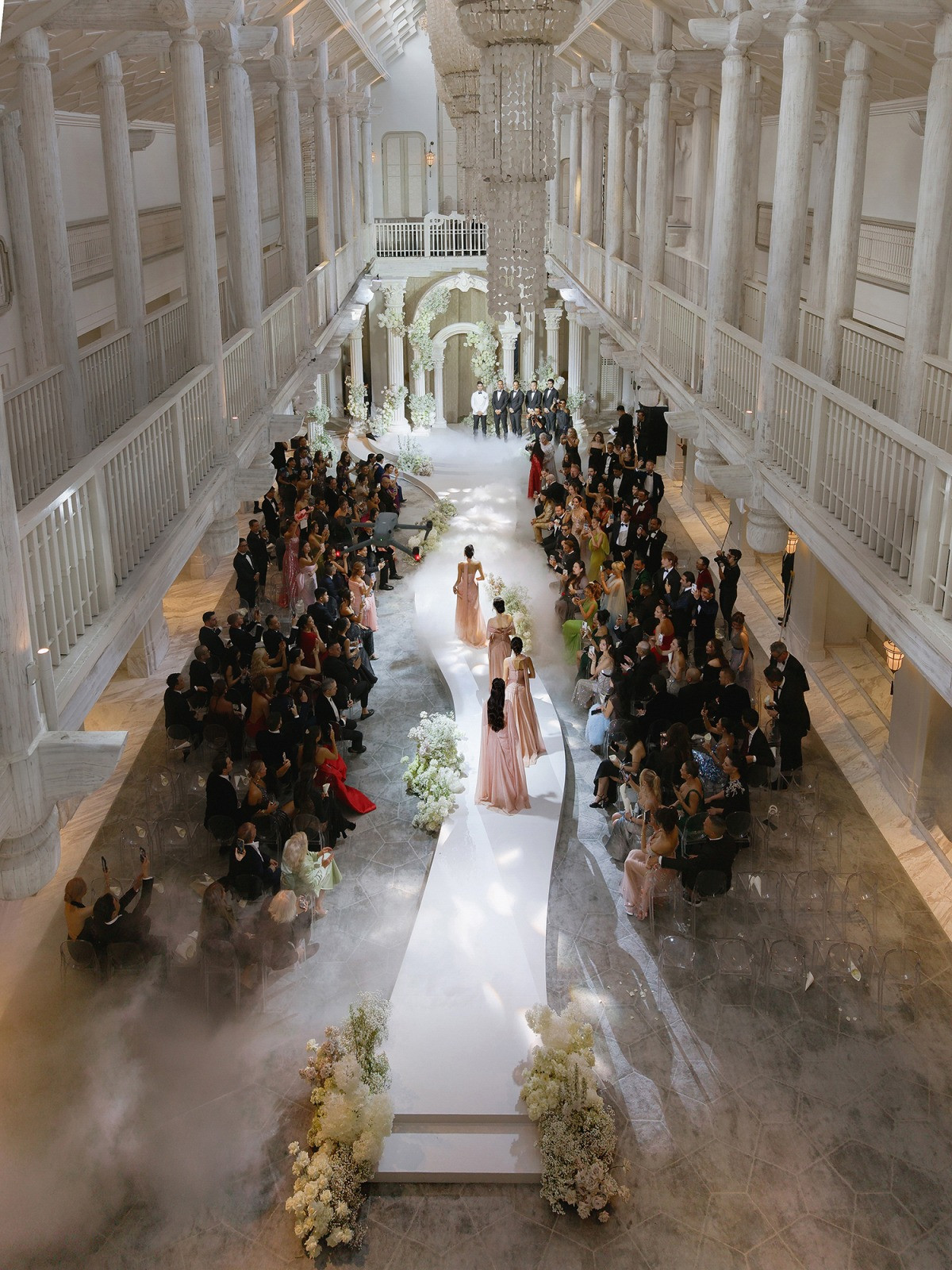Tiệc cưới tại Đà Nẵng của fashionista Tiên Nguyễn có bối cảnh lấy cảm hứng Hollywood thời hoàng kim thập niên 1920 - 1960. Từ một số hình ảnh đăng tải cho thấy, không gian cưới được trang trí hoa tươi theo phong cách Phục hưng với tông màu trắng chủ đạo, tạo cảm giác xa hoa, sang trọng.