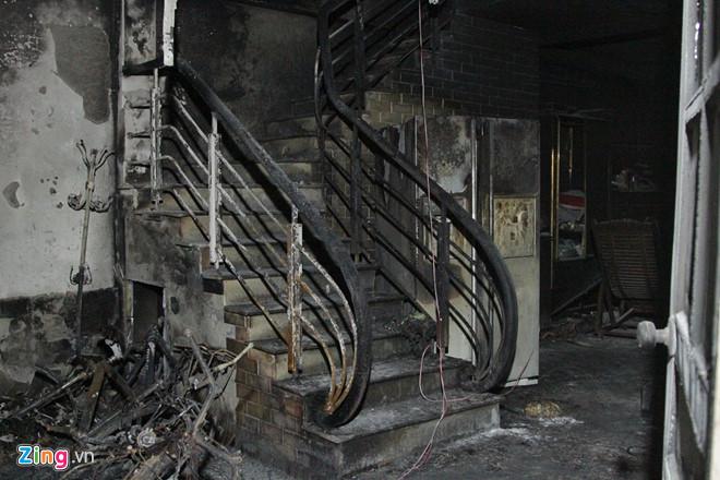 Tại hiện trường, cả tầng 1 ngôi nhà bị thiêu rụi gần hết. Một chiếc xe máy và nhiều xe đạp bị cháy trơ khung. Ảnh: Ngọc Tân.