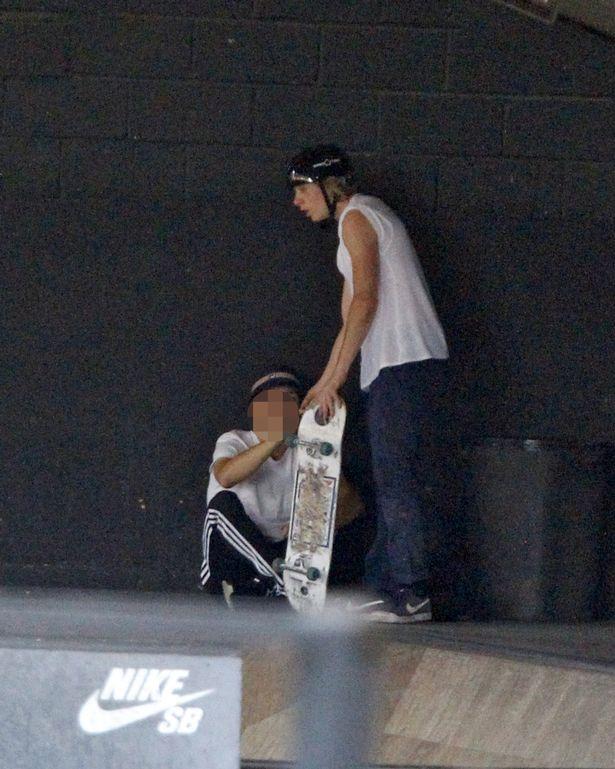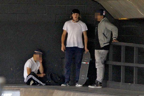 Brooklyn Beckham tham gia trượt băng cùng những người bạn hôm 5/9. Anh bạn của Brooklyn mặc áo phông trắng đang ngồi trên nền trượt để hút thuốc lá.
