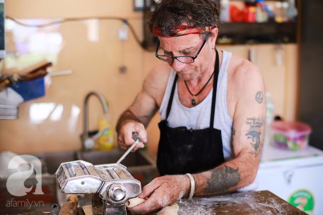 Khi tôi đến, vợ chồng anh đang ngồi tỉ mẩn nhào bột, cắt sợi mì phơi sẵn, chuẩn bị cho ca phục vụ buổi tối. Antonio chào tôi bằng tiếng Anh đặc sệt giọng Ý, tay đầy bột trắng phớ vẫy vẫy tung trời. Người đàn ông tóc xoăn tít này thật mến khách.