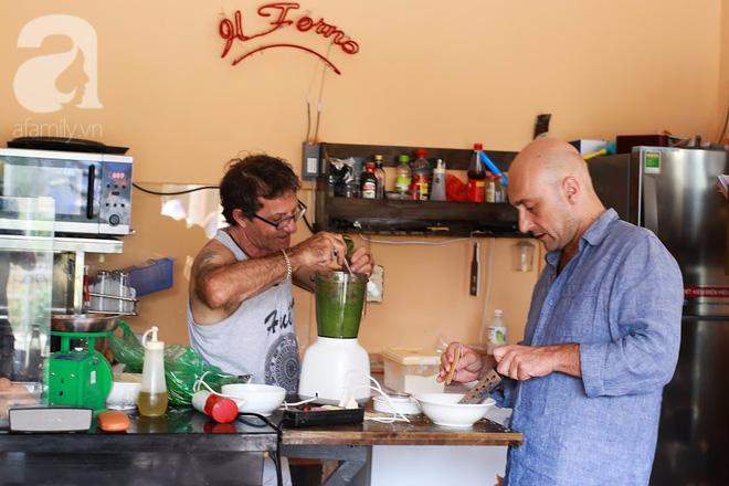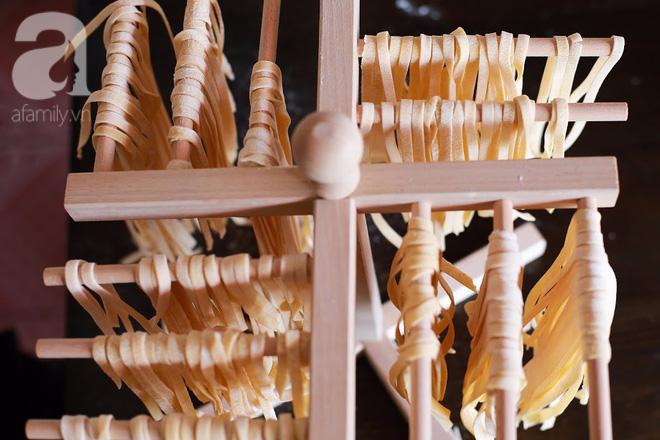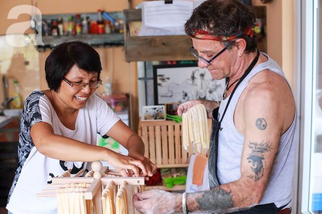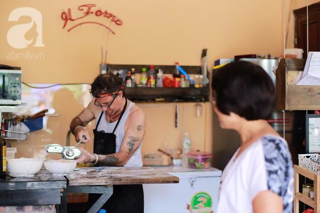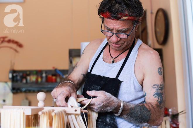 Khi tôi đến, vợ chồng anh đang ngồi tỉ mẩn nhào bột, cắt sợi mì phơi sẵn, chuẩn bị cho ca phục vụ buổi tối. Antonio chào tôi bằng tiếng Anh đặc sệt giọng Ý, tay đầy bột trắng phớ vẫy vẫy tung trời. Người đàn ông tóc xoăn tít này thật mến khách.