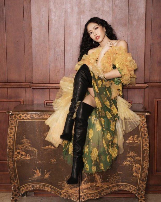 Hình ảnh quý phái pha 1 chút nổi loạn nhưng vẫn giữ được độ fashion khi người đẹp kết hợp giữa váy bèo nhún xếp tầng và boots da 1 mét.