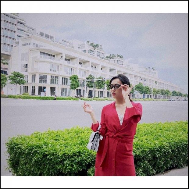 Nổi bật với set dồ đỏ thanh lịch, hiện đại phối cùng kính mắt mèo thời thượng.