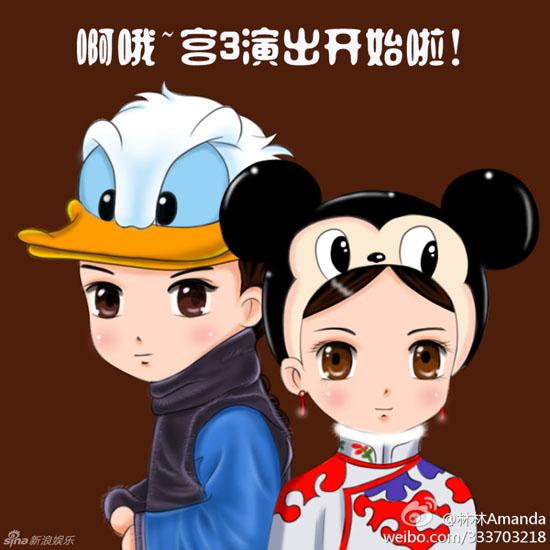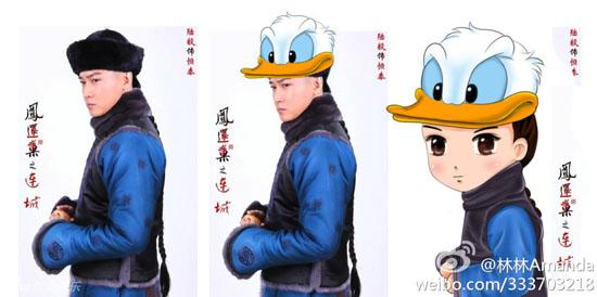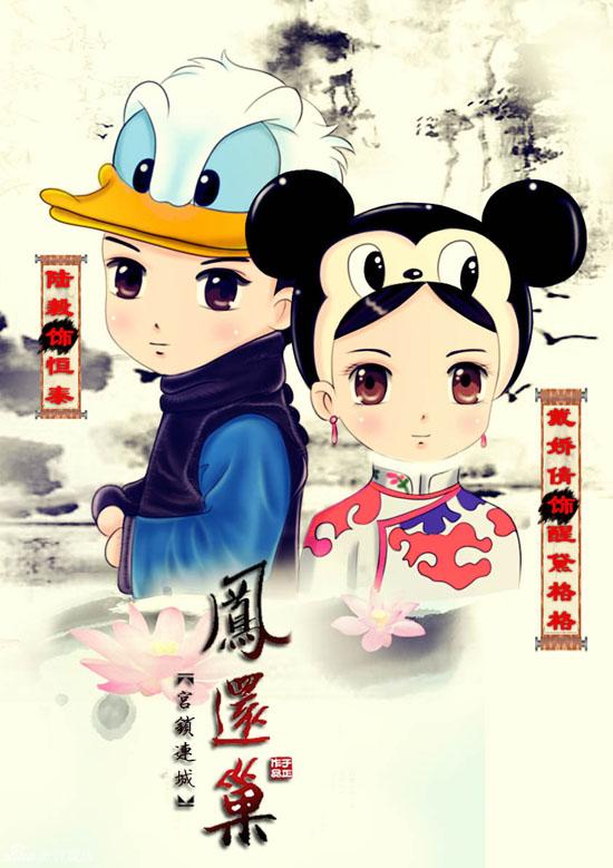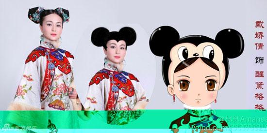 Vì kiểu tóc của Đới Kiều Thiên có phần giống với hai chiếc tai chuột nên cư dân mạng đã photoshop chúng thành đôi tai của chuột Mickey. Ở phiên bản hoạt hình, trông cô nàng Đới Kiều Thiên thêm phần long lanh. Trong khi đó, tạo hình của anh chàng Lục Nghị cũng đáng yêu không kém khi chiếc mũ của anh được chuyển thành hình chú vịt Donald. Cặp đôi Mickey và Donald phiên bản cổ trang được cư dân mạng hết lời khen là dễ thương.