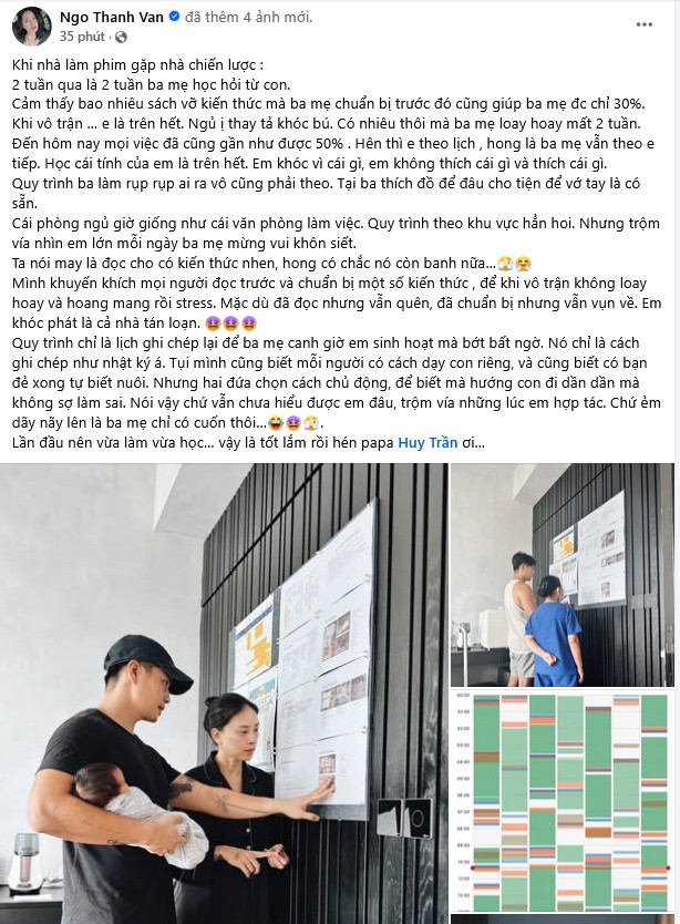 Ngoài ra, Ngô Thanh Vân cũng cho biết: "Quy trình chỉ là lịch ghi chép lại để ba mẹ canh giờ em sinh hoạt mà bớt bất ngờ. Nó chỉ là cách ghi chép như nhật ký á. Tụi mình cũng biết mỗi người có cách dạy con riêng và cũng biết có bạn đẻ xong tự biết nuôi. Nhưng hai đứa chọn cách chủ động, để biết mà hướng con đi dần dần mà không sợ làm sai. Nói vậy chứ vẫn chưa hiểu được em đâu, trộm vía những lúc em hợp tác. Chứ em dãy nãy lên là ba mẹ chỉ có cuống thôi."