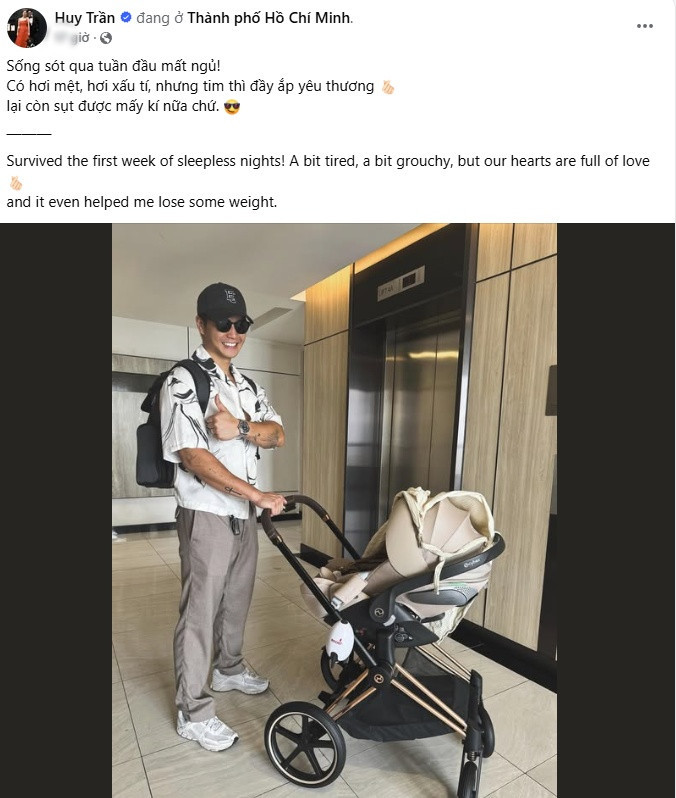 Sau 1 tuần đầu tiên chăm con vất vả, ông xã Huy Trần tự công khai hình ảnh "bỉm sữa" của mình trên trang cá nhân kèm dòng trạng thái: "Sống sót qua tuần đầu mất ngủ. Có hơi mệt, hơi xấu tí, nhưng tim thì đầy ắp yêu thương, lại còn sụt được mấy kí nữa chứ."