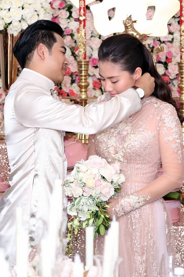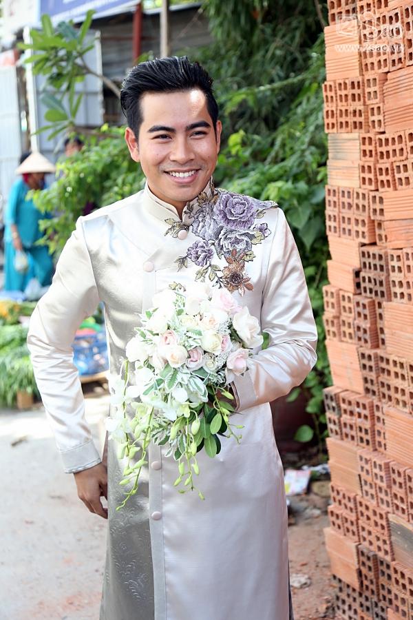 Chú rể Thanh Bình diện áo dài lụa thêu cầu kỳ.