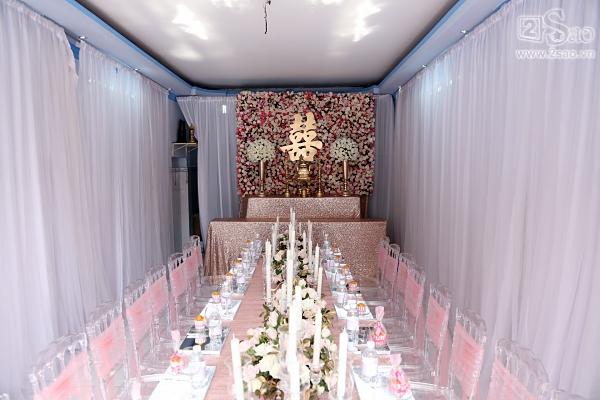 Bàn tiệc được trang trí với màu trắng và hồng chủ đạo.