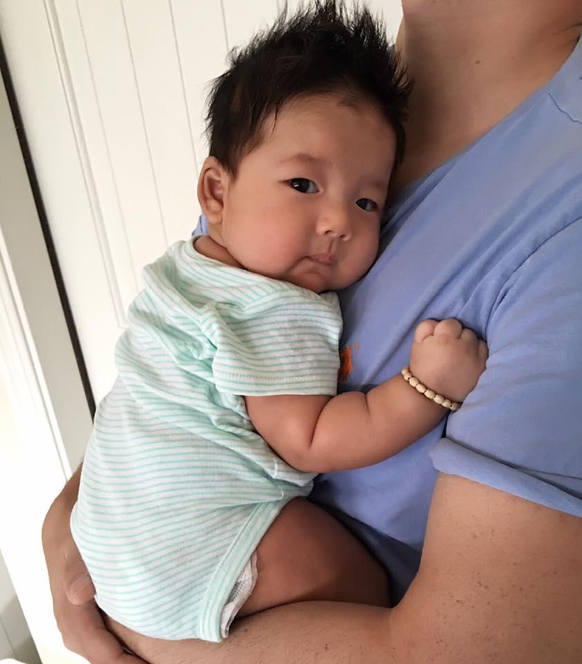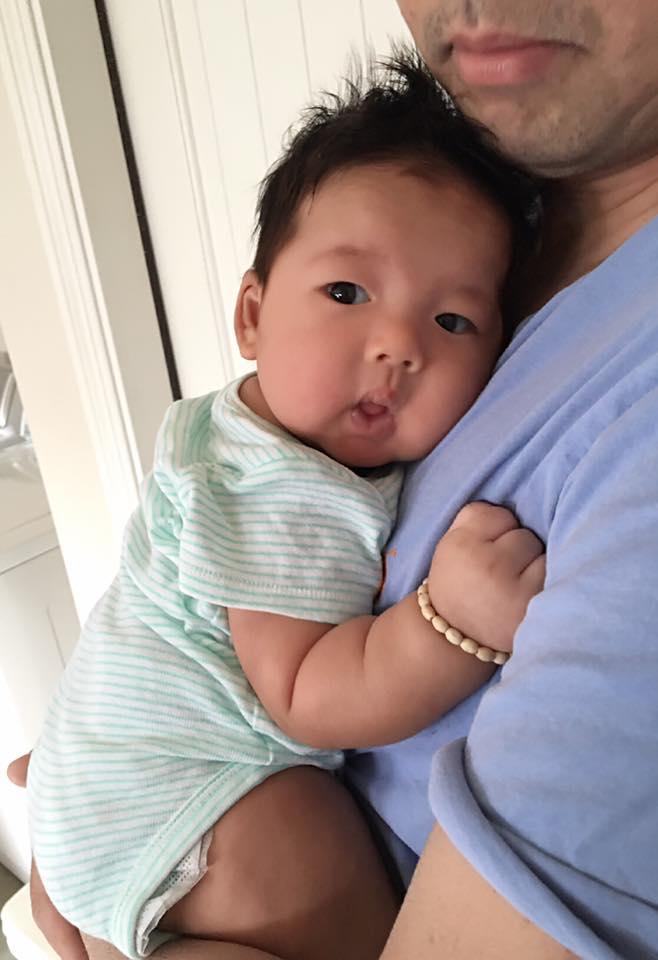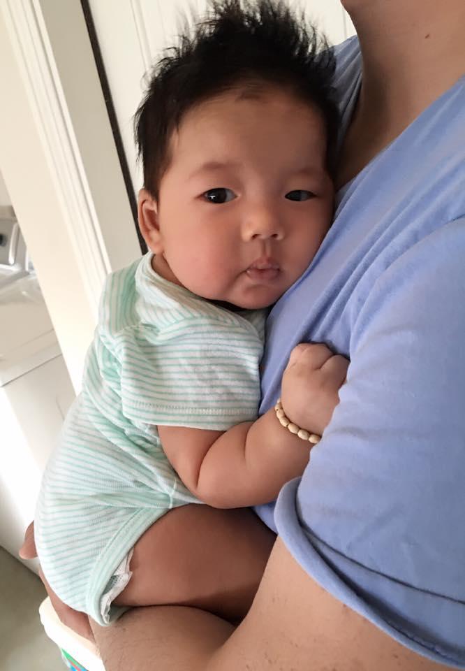 Biểu cảm dễ thương của con trai Ngọc Quyên khi được bố cưng nựng chăm sóc