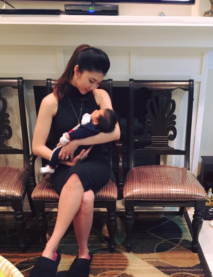 Trong khi mẹ khoe dáng vóc đằm thắm sau sinh với chiếc váy đen huyền bí thì nhóc tỳ