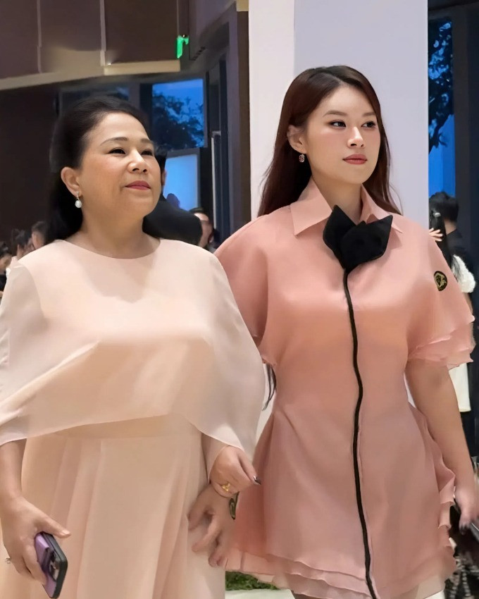 Xuất hiện ở tiệc cưới, nữ diễn viên chọn bộ váy màu hồng ngang đùi kết hợp quần tất đen. Trong khi đó. mẹ cô tôn nét sang trọng cùng đầm tay cape màu be.