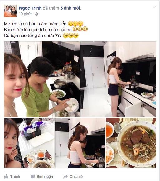 Ngọc Trinh hào hứng khoe những hình ảnh mẹ từ quê lên nấu ăn cho mình.