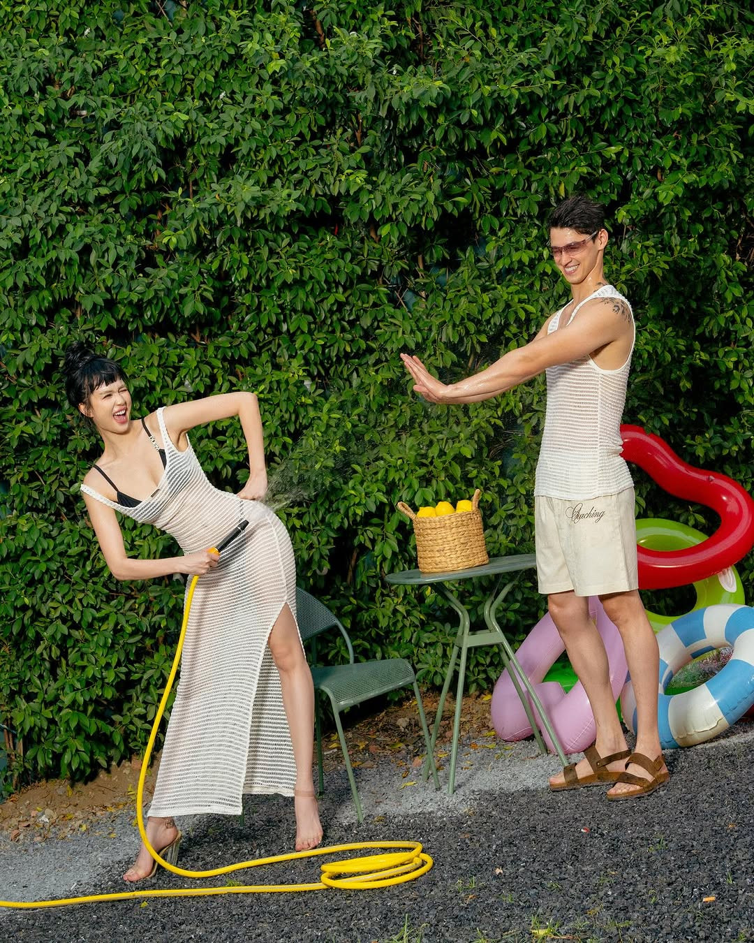 Trong hình, người đẹp gốc Trà Vinh trưng trổ body gợi cảm với đầm "lưới đánh cá" để lộ nội y màu đen bên trong. Bộ ảnh mang hơi hướng mùa hè, phù hợp với những chuyến du lịch biển tận hưởng "vitamin sea".