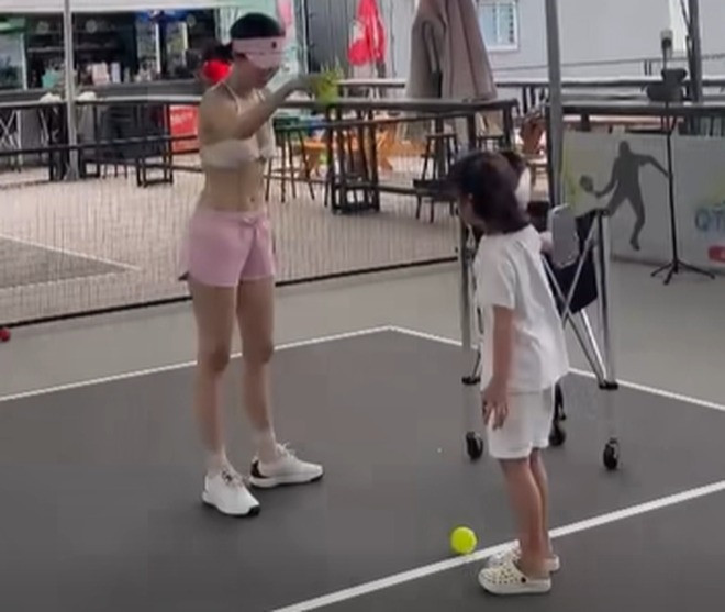 Mới đây, người đẹp gốc Trà Vinh chia sẻ đoạn clip đưa con gái nuôi là bé He ra sân tập pickleball.