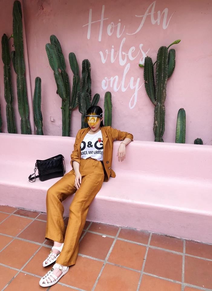 Kỳ Duyên khoe street style trendy trong bộ suit gam màu cam đất mix áo phông D&G sành điệu. Hoa hậu khéo léo nâng tầm set đồ bằng phụ kiện túi xách Chanel, sandal Gucci và mũ lưỡi chai che nắng sành điệu.