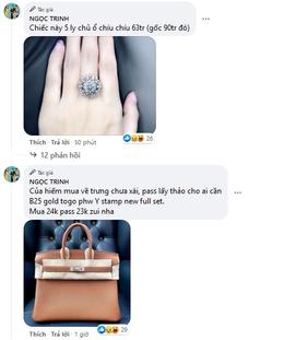 Chiếc nhẫn kim cương Ngọc Trinh pass 63 triệu đồng còn chiếc túi Hermes màu camel thanh lý vui 530 triệu đồng.