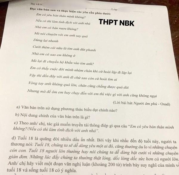 Đề thi trích dẫn một phần lời bài rap Người âm phủ với câu hỏi liên quan đến phương thức biểu đạt của văn bản và những hàm ý ẩn chứa sau những câu chữ trong bài. Ngoài ra, đề bài còn yêu cầu học sinh tìm hiểu về câu hát: "Em có yêu bản thân mình không? Nếu có thì làm tình địch với anh nhá" và tìm hiểu về thông điệp liên quan.
