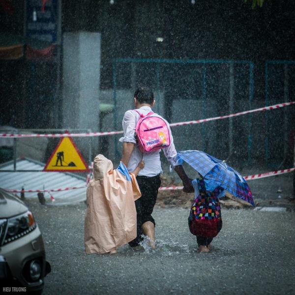Mới đây, một bức hình của tác giả Hieu Truong được đăng tải trên mạng xã hội đã thu hút được sự chú ý của cộng đồng mạng. Bức hình chụp lại khoảnh khắc một người đàn ông đầu trần, 2 tay dắt 2 con nhỏ lội qua vùng nước ngập dưới trời mưa tầm tã, được tác giả đặt cho cái tên "Làm cha".