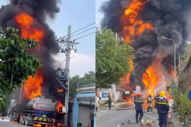 Ngọn lửa nhanh chóng bao trùm toàn bộ xe, tạo cột lửa và khói đen bốc cao. Nhiều tiếng nổ lớn vang lên. Sau đó, lửa lan sang trụ điện ven đường, uy hiếp các nhà dân xung quanh, khiến nhiều người phải di dời tài sản đến khu vực an toàn.