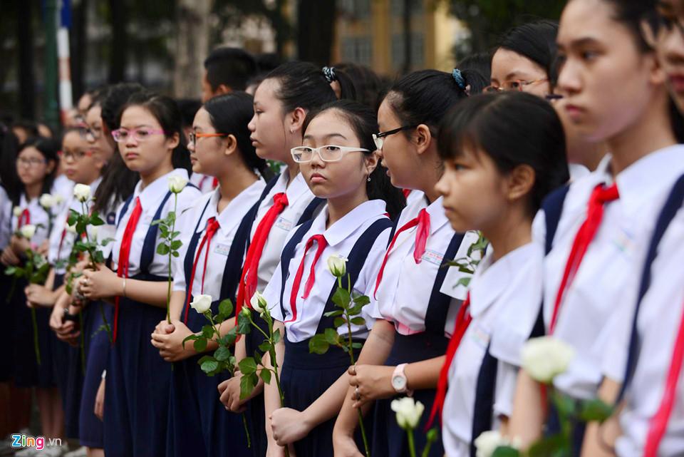 Các em học sinh trường THCS Trường Chinh, quận Tân Bình mang trên tay những bông hoa hồng trắng để từ biệt nguyên Thủ tướng Phan Văn Khải.
