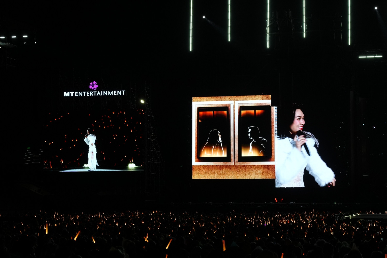 Dáng đứng trầm lặng, cùng khoảng cách tinh tế giữa hai người, tạo nên một cảm giác vừa gần gũi vừa xa cách, như thể họ đang giữ một mối quan hệ nhiều tầng cảm xúc, còn ẩn trong bóng tối. Bàn tay Mỹ Tâm đặt lên vai anh một cách nhẹ nhàng, dịu dàng nhưng cũng chứa đựng một sự do dự khó gọi tên.
