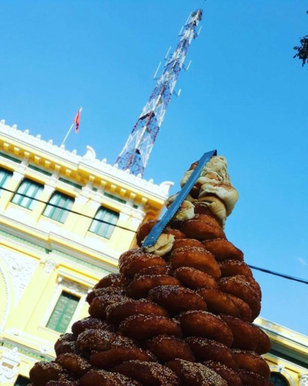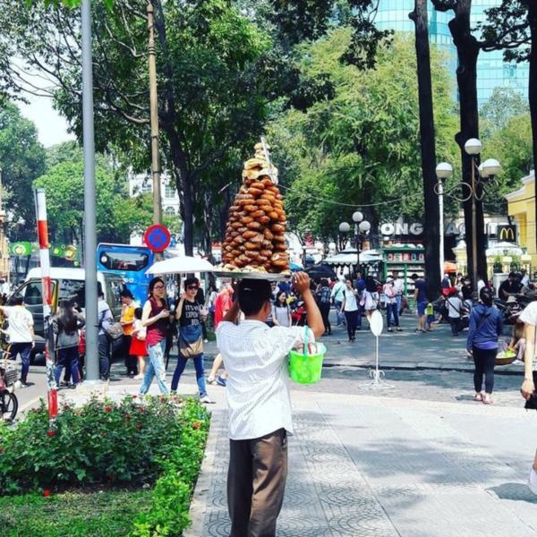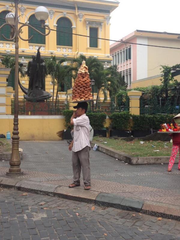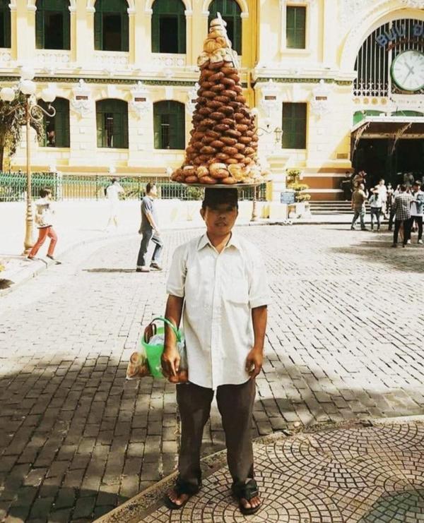 Vậy mà gười đàn ông vẫn đội cả mâm bánh đi bán rong quanh khu vực nhà thờ Đức Bà, TP. HCM. Người này coi việc để mâm bánh lên đầu là bí quyết để bán hàng chạy hơn.