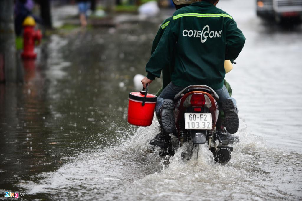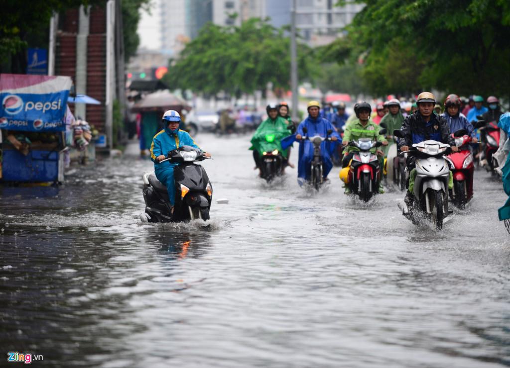 Người đi xe máy phải chạy sát lề đường, tránh vùng nước ngập sâu.