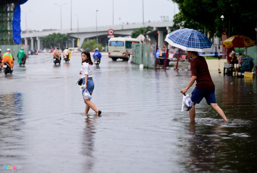 Để tránh bị ướt, công nhân co chân di chuyển qua đường ngập trên đường Điện Biên Phủ.