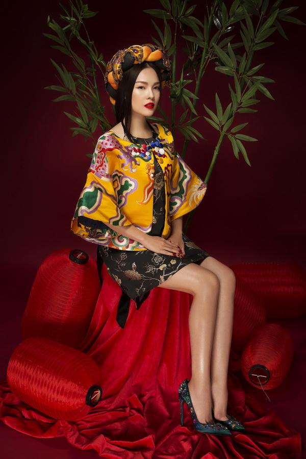 Không xuất hiện với áo dài truyền thống, Tết Bính Thân 2016 này Dương Cẩm Lynh chọn áo dài cách tân tông xanh nền nã chất liệu gấm, thổ cẩm với những hoạt tiết thêu tay trên cổ áo, khăn vấn vô cùng ấn tượng. Qua đó, thể hiện được gout thời trang tinh tế, độc đáo của cô nàng. Đây cũng là xu hướng “gây bão” vừa qua tại Tuần lễ thời trang 2015, khi được nhiều sao Việt và giới mộ điệu ưa chuộng.