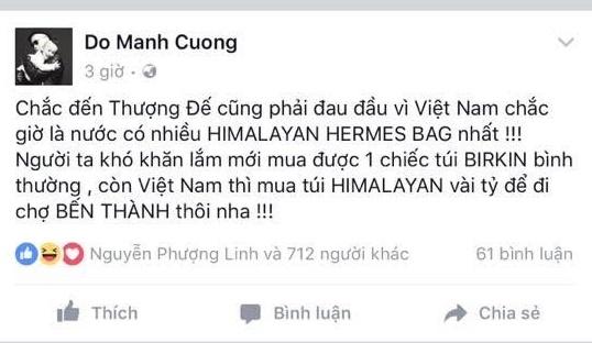 Cũng trong sáng nay, câu chuyện về chiếc túi dàn mỹ nhân Việt đang xách là auth hay fake được bàn luận rôm rả. Người đầu tiên lên tiếng đá xéo dàn mỹ nhân Việt dùng túi Birkin cá sấu fake là nhà thiết kế Đỗ Mạnh Cường. “Chắc đến Thượng đế cũng phải đau đầu vì Việt Nam chắc giờ là nước có nhiều Himalayan Hermes bag nhất. Người ta khó khăn lắm mới mua được một chiếc túi birkin bình thường, còn Việt Nam thì mua túi Himalayan vài tỷ để đi chợ Bến Thành thôi”, Đỗ Mạnh Cường nói trên trang cá nhân của anh.