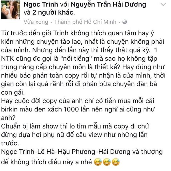 Chuẩn bị làm show thì lo tìm mẫu mà copy đi chứ đừng dựa hơi phụ nữ để câu view như những lần trước. Ngọc Trinh - Lê Hà - Hậu Phương - Hải Dương và thượng đế không thích điều này anh nhé".