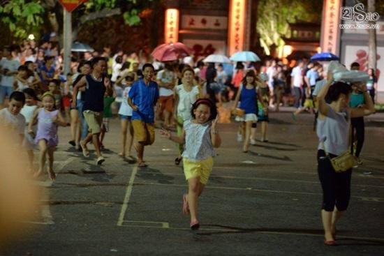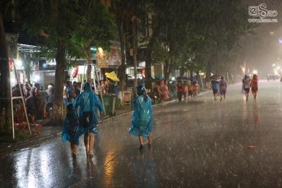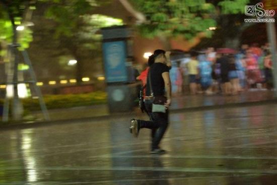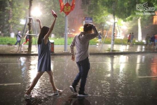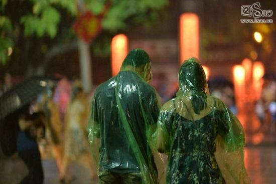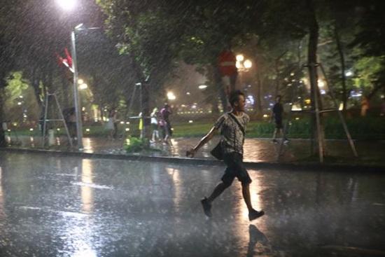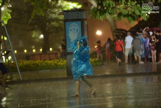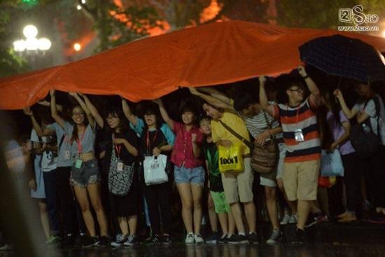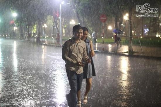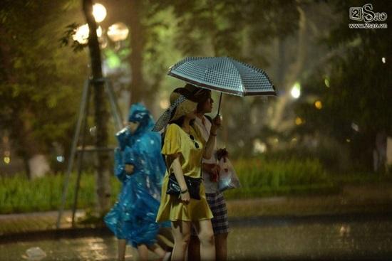 Khoảng 22h, một cơn mưa lớn bất chợt ập xuống khiến những người đang đi bộ ở khu vực Hồ Gươm phải vội vã tìm chỗ trú mưa. Do không chuẩn bị từ trước, nhiều người đã rơi vào tình trạng ướt sạch từ đầu tới chân.